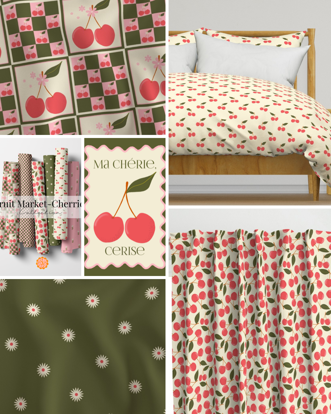 A playful yet polished cherry print collection inspired by European fruit markets and vintage Parisian charm. Featuring bold checkerboards, scattered cherry motifs and sweet floral accents in a rich palette of olive green, blush pink and juicy red, this range blends nostalgic style with modern design.