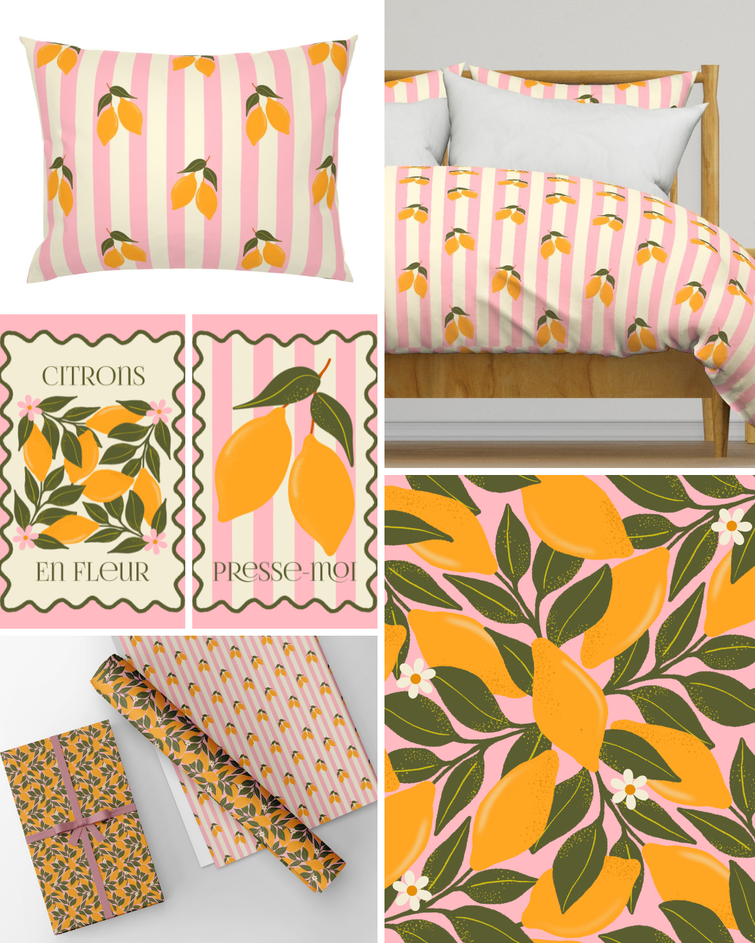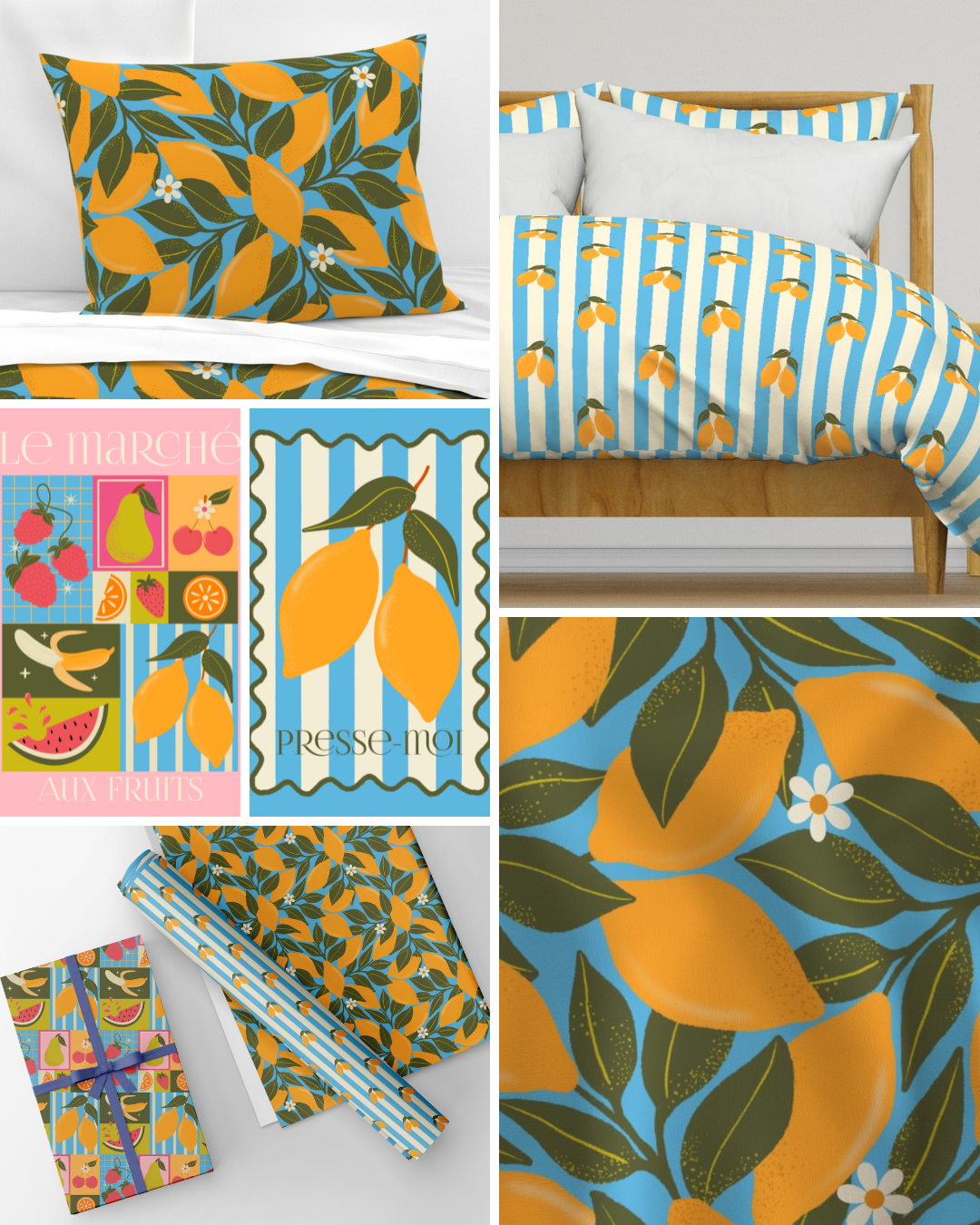 Featuring hero lemon prints, leafy repeats, soft florals and coordinating stripes, this collection balances freshness with warmth — combining Mediterranean summer energy with a retro European fruit-stall aesthetic. The palette of lemon yellow, sky blue, blush pink and leafy green creates strong visual impact while remaining commercially versatile.